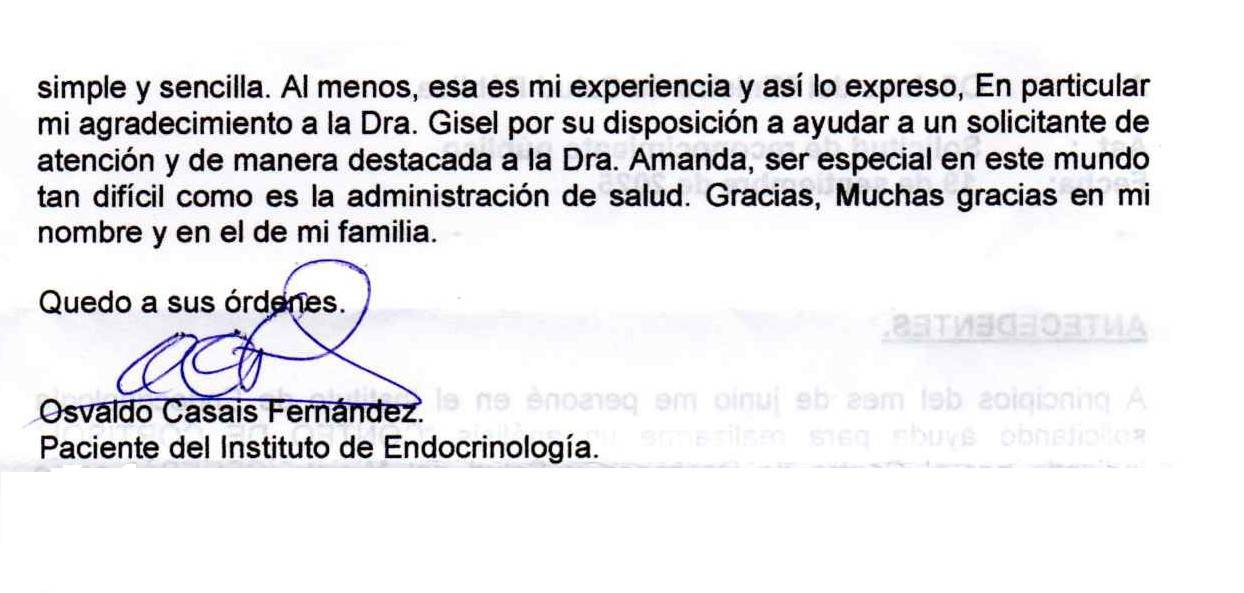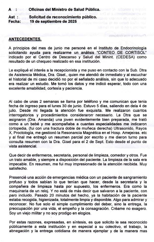 Carta al Ministro de Salud Pública de un paciente en reconocimiento a los trabajadores del Instituto de Endocrinología. ¡Muchas felicidades! 👏👏👏